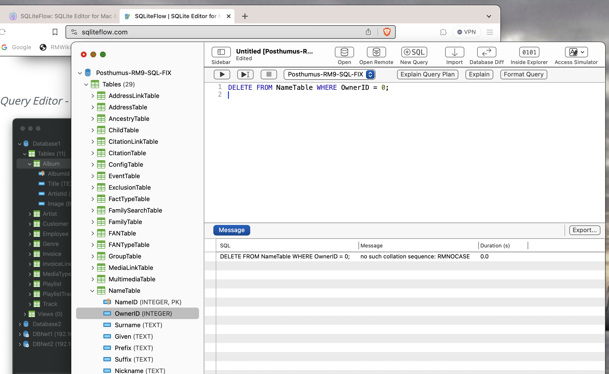 Find that my Mac (now running Sonoma 14.1.1, Apple M1; RootsMagic 9.1.0) has SQlite 3.39.5 already built-in. So I downloaded/installed SQLite Flow in order to run the recommended query: DELETE FROM NameTable WHERE OwnerID = 0;